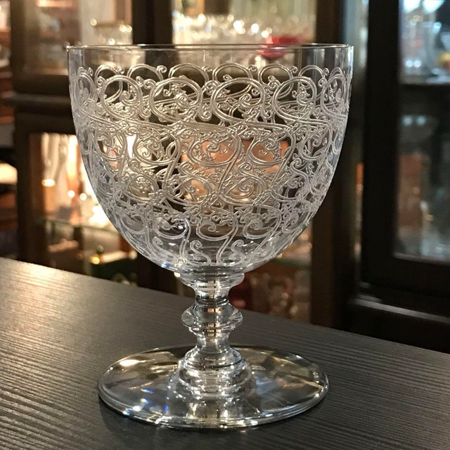ご覧いただき誠にありがとうございます。 こちらは オールドバカラ BACCARAT より、 名作《ローハン Rohan》水用グラス(ワイングラスとしても)でございます。 ローハン特有の模様は、 アシッドエッチング(酸彫刻)によって施されたもの。 繊細で奥行きのある彫装飾が、 独特の存在感と気品を感じさせてくれます。 長い年月を経た今もなお、 そのデザインは色褪せることなく、 むしろ時を重ねるごとに美しさを増しています。 ⸻ 【サイズ・特徴】 こちらはローハンの中でも 一番大きなサイズ となります。 和やかで明るい雰囲気を運んでくれそうな佇まいで、 テーブルに置くだけでも空間が華やぎます。 水やワインはもちろん、 プリンやアイスクリームの盛り合わせなど、 デザートグラスとしてもおすすめです。 ぜひお手に取って、その美しさをご覧くださいませ。 ⸻ 【コンディションについて】 アンティーク品のため、 割れ・欠けはございませんが、 製造時についた気泡、よれ、 経年による拭きキズ等が見られる場合がございます。 アンティークならではの風合いとして ご理解いただけましたら幸いです。 詳細はお写真にてご確認ください。 艶のある美品です。 ⸻ 【サイズ】 ・高さ:約11.2cm ・口径:約8.9cm ・満水容量:約300ml 1936年以前のお品のため、バカラマークはございません。 ⸻ 【ローハンについて】 ローハンシリーズは、 バカラの作品群の中でも特に息の長い人気を誇るシリーズです。 シャトーブリアン、グヴュ、コンブール、ジョゼリンと 同じ装飾がボウル部分に施されています。 葉のモチーフは、 酸によるエングレーヴィング(彫刻)技法で表現されており、 この技法は1864年に完成されたものです。 アラベスク調の装飾を 繰り返し施すことができる、 非常に高度で美しい技法です。
