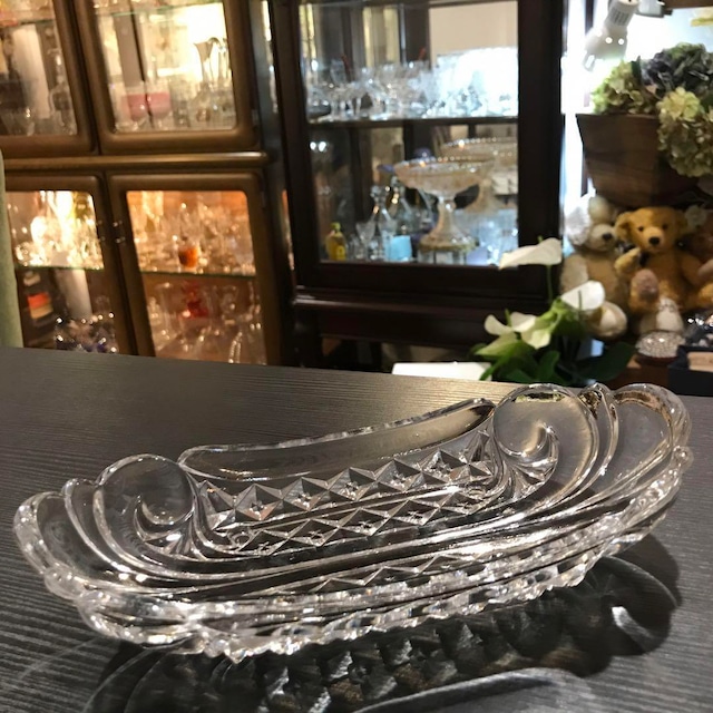 ご覧いただきましてありがとうございます。 オールドバカラBaccaratラヴィエRavier S558 の出品でございます。 Ravier ラヴィエはフランスで使用されている食事の前にいただく 前菜を盛りつけるお皿のことです。 とても楽しい形をした素敵なクリスタルのお皿 トレイ ラヴィエ 単調な繰り返しの模様とはまたちょっと違った趣きの特徴的なモチーフによる 飽きのこない独特の姿形がとてもユニークでうれしいですね♪ 細部まで手抜かりなくまとめられたデザインは見ていてどこか心うごくものが あります。 重厚で安定感もあり頼りになる大きさのこのトレイを ぜひお楽しみくださいませ♡ 大変古いお品のためサインはございませんが 1907年のバカラカタログにS558で掲載されています。 アンティークのお品です。 割れ、欠けなど無く、良好な状態かと思いますが 製造時についた気泡、よれ、細かいチップ(P.7左矢印) 経年によるスレなどございます(P7.右矢印) 写真でご確認ください。 艶のある美品です。 アンティーク品にご理解ある方のご入札を お待ちしております。 サイズはおよそ高さ4.5cm 縦9.4cm横20.4cm 一度手にとってご覧になればきっと凜とした その美しさに魅了されるでしょう。 くつろぎのひとときをバカラと共にお過ごし下さいませ。 レア物です。 小物入れやアクセサリー入れ、チーズやナッツなどのおつまみ入れ、 可愛らしいお菓子を入れたりもちろんふつうにお料理を盛ってみたり、、 幅があるので用途が工夫次第でどこまでも広がりますね☆ オールドバカラ、サンルイ、ラリック等の味わいのある魅力的な カトラリーケースをお探しの方へ♡