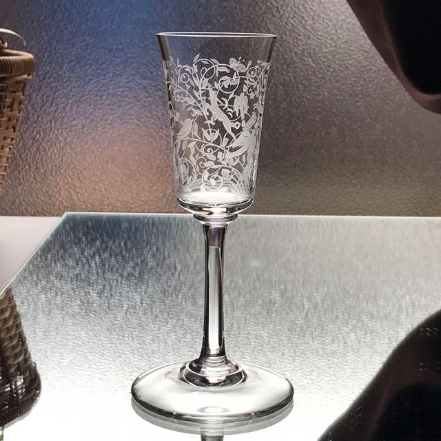 こちらは、**フランスの老舗クリスタルブランド「バカラ(Baccarat)」**より、《ジェッダ Djeddah》と名付けられた希少なワイングラスのご紹介です。 本モデルは、バカラの専属デザイナーとして知られる**ジョルジュ・シュバリエ(Georges Chevalier)によってデザインされました。 現在ではほとんど市場に出てこない大変貴重なお品です。 ✧ 特徴 ✧ 繊細なアラベスク文様の中に、 • 犬 • ツバメや小鳥たち • トンボ、蝶、うさぎ、カタツムリ • そしてヘビまでもが… まるで物語のワンシーンのように隠れています。 植物を背景に、さまざまな動物たちが見え隠れする装飾は、遊び心と芸術性を兼ね備えた魅力的なデザイン。 眺めているだけで、まるでおとぎ話の中に迷い込んだような気分にさせてくれるグラスです。 童心に返って、つい細部まで見入ってしまうかもしれません。 ✧ コンディション ✧ こちらはアンティーク品です。 割れや欠けはなく、艶のある美品です。 製造時に生じた気泡・よれ・スレなどがある場合がございますが、アンティークならではの味わいとしてご理解いただけましたら幸いです。 お写真にて状態をご確認くださいませ。 ⸻ ✧ サイズ ✧ • 高さ:約11cm • 口径:約5.7cm • 満水容量:約120ml • バカラマークあり(底面に刻印) ※手に馴染む小ぶりなサイズ感も魅力のひとつです。 ✧ こんな方におすすめ ✧ • 他と被らない希少なアンティークグラスをお探しの方 • バカラ/サンルイ/ラリックなどフランスアンティークにご興味のある方 • 贈り物や大切な方へのプレゼントとして • くつろぎの時間に特別なグラスをお使いになりたい方 最後の1客ですので、 ご興味のある方はお早めにどうぞ。