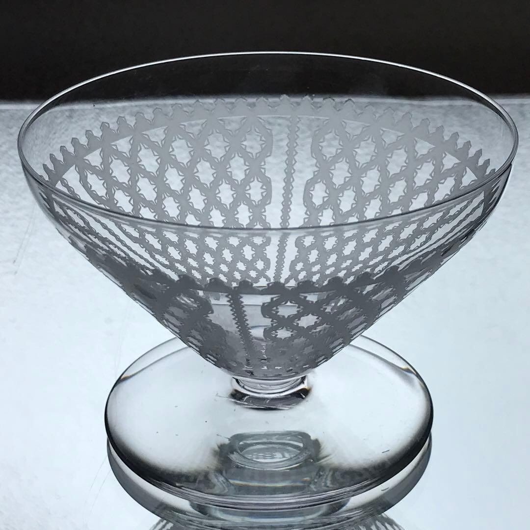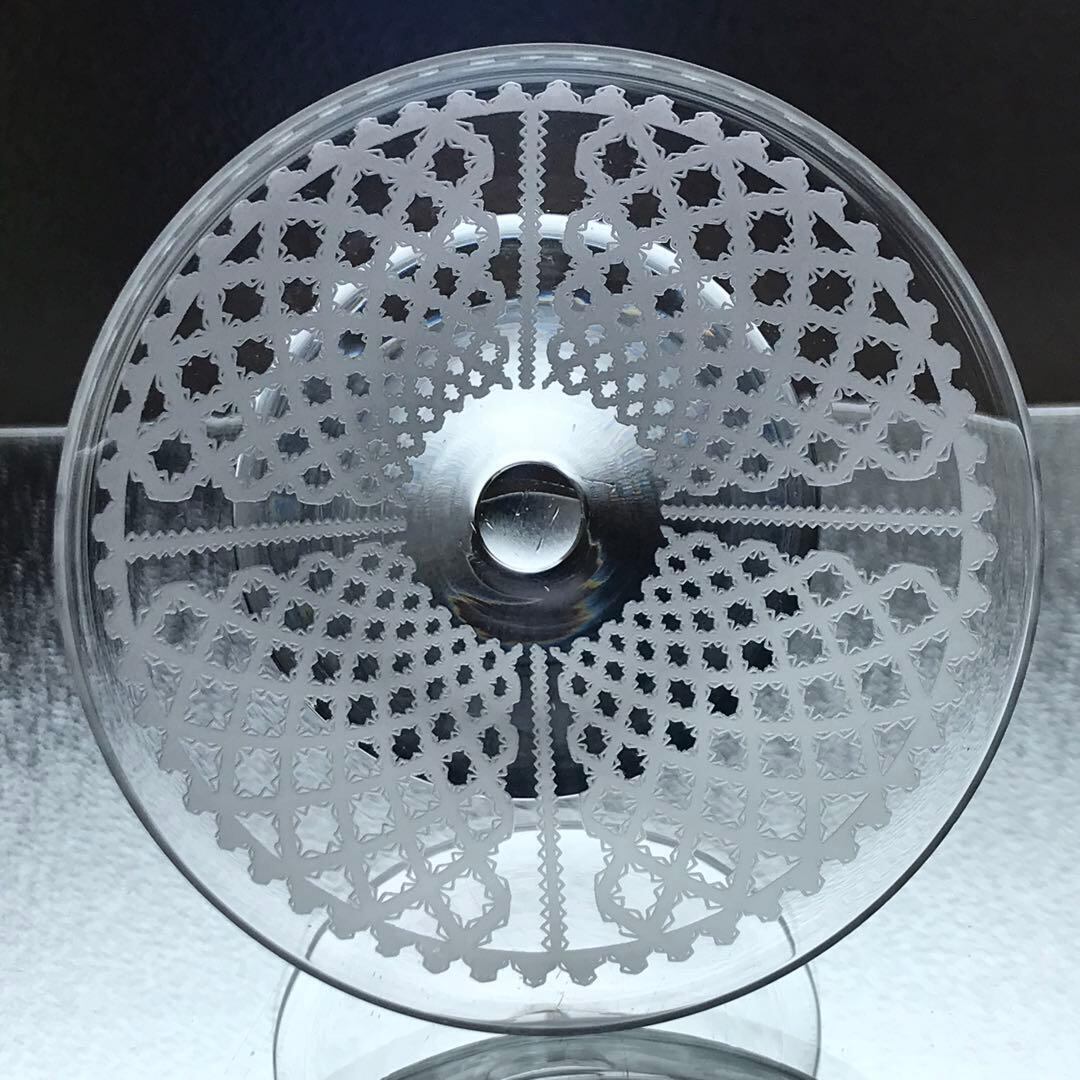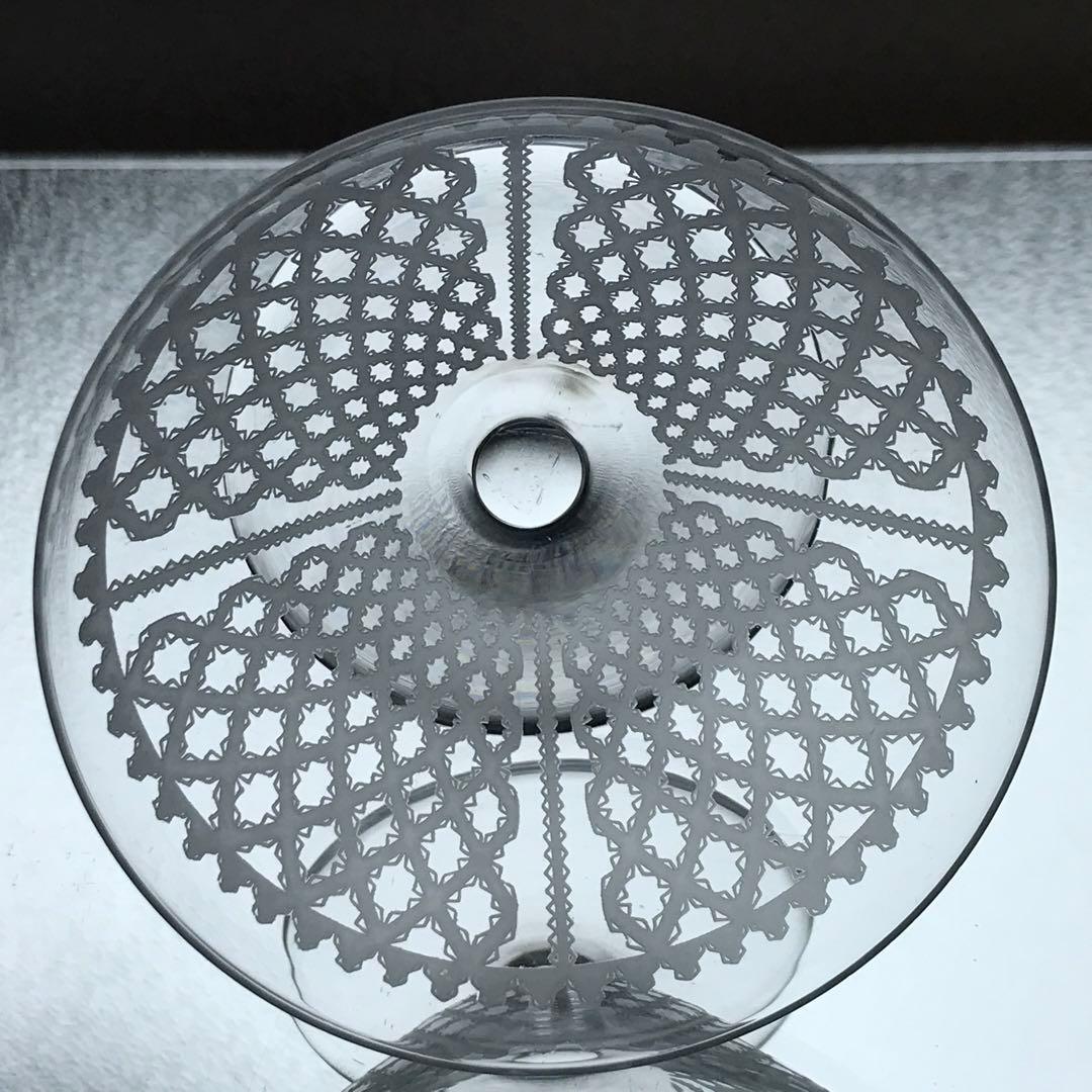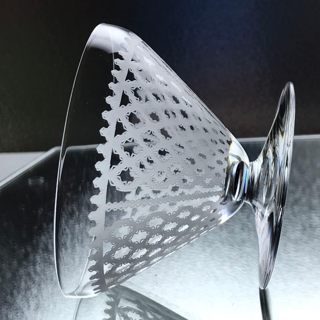 美しいレースで縁取りされたリボンが格子状に丁寧にグラス全体に施されています。