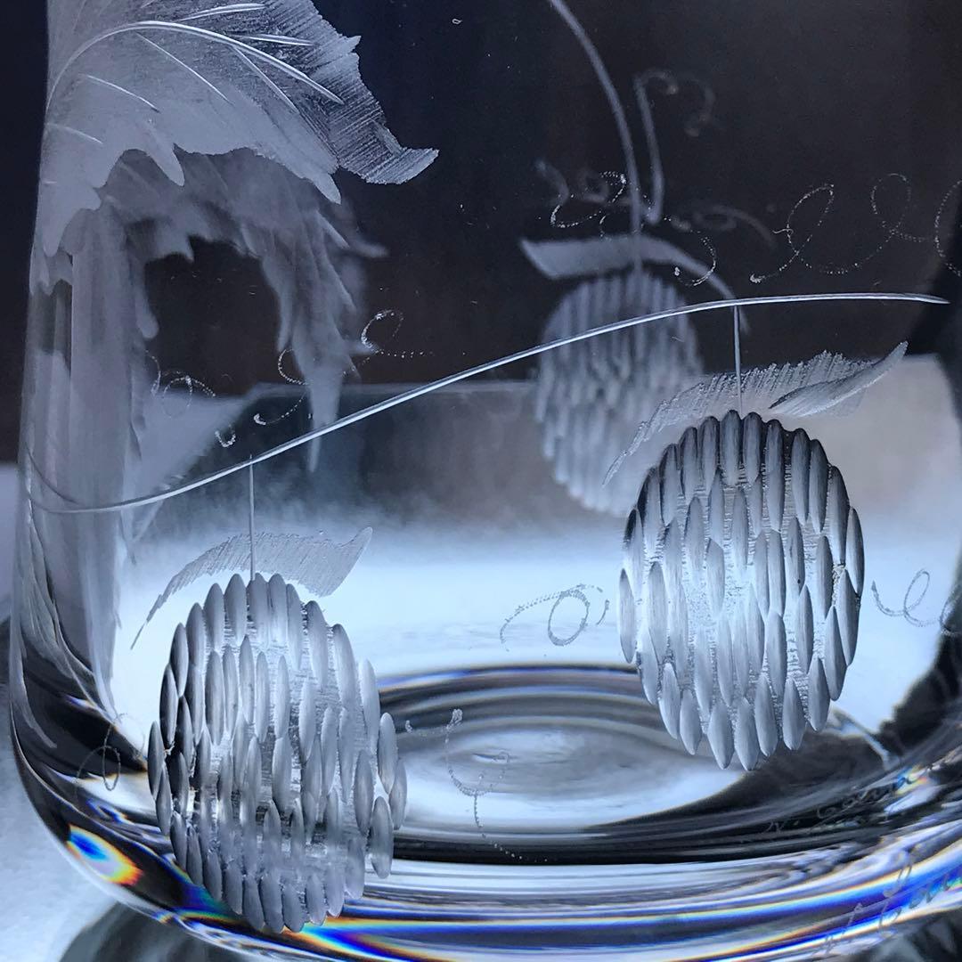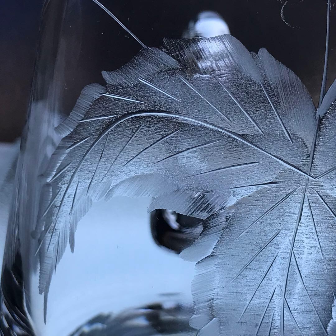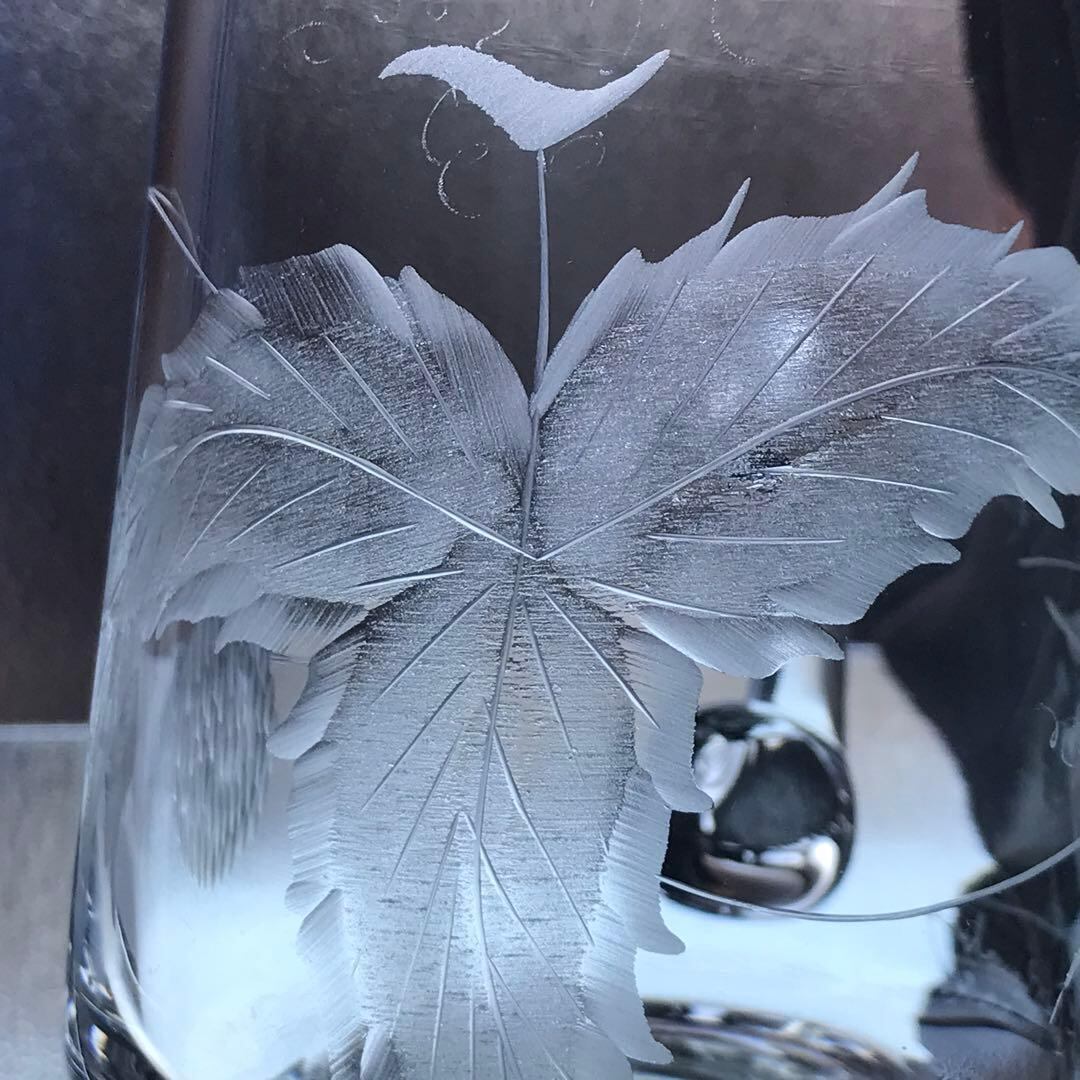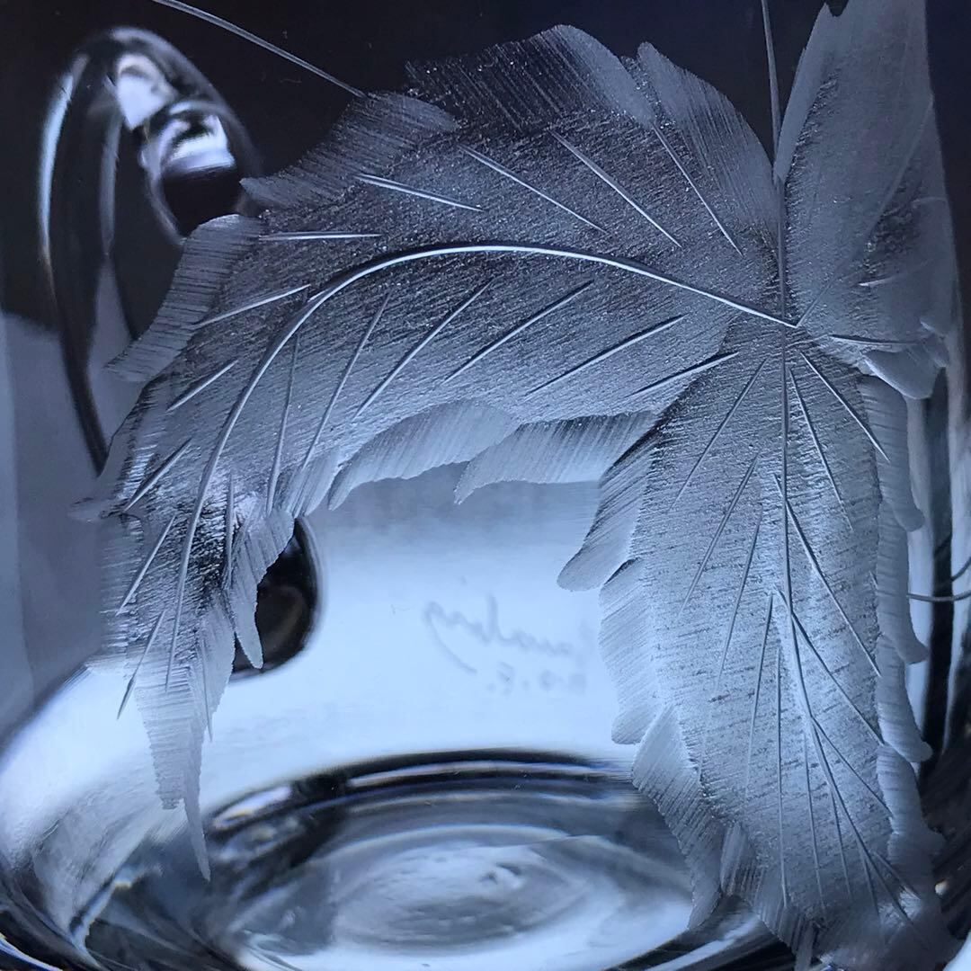 型吹きクリスタルに伝統的な石臼を用いて彫られた葉っぱが