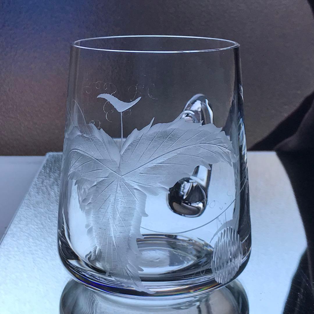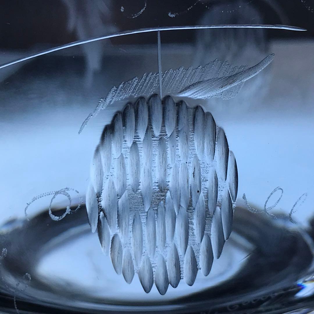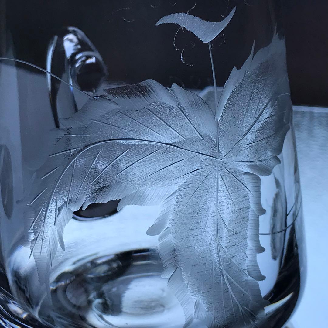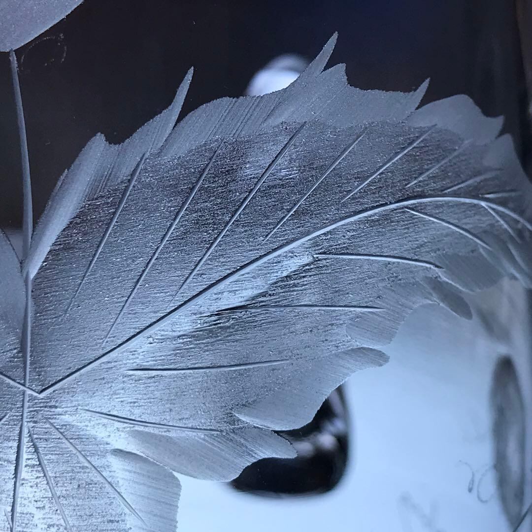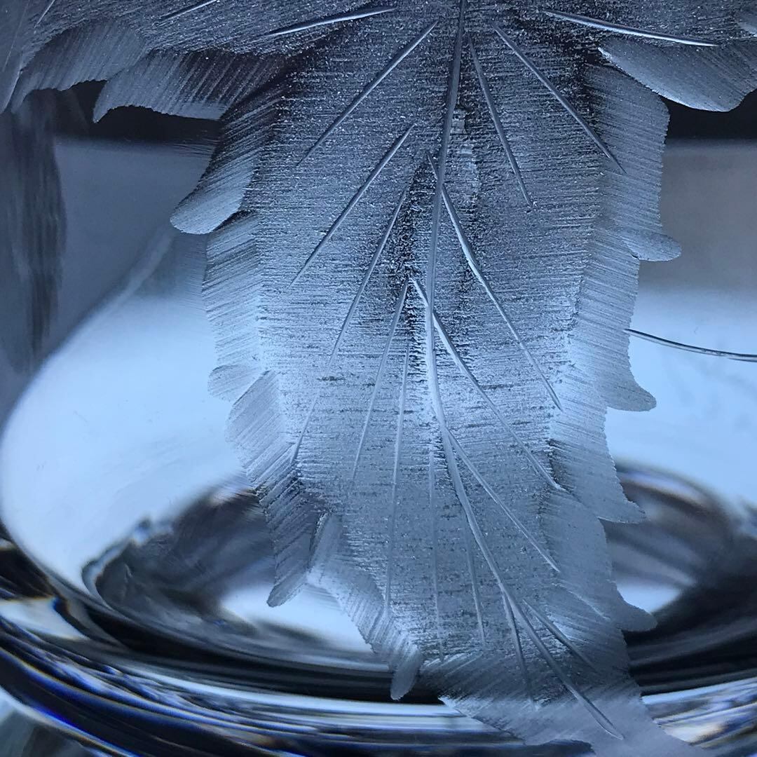 型吹きクリスタルに伝統的な石臼を用いて彫られた葉っぱが