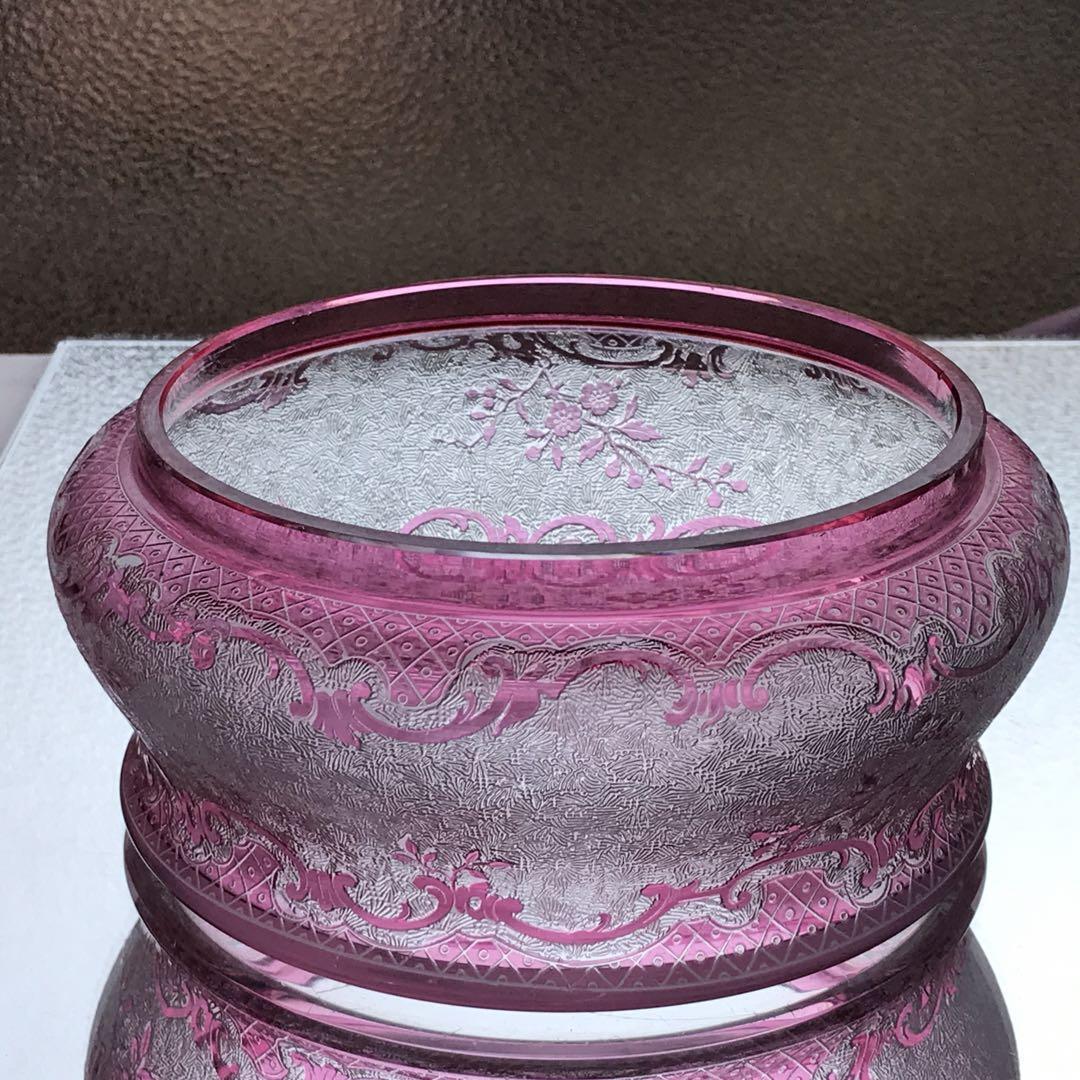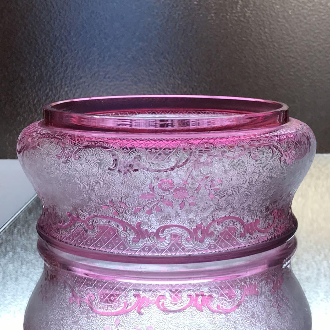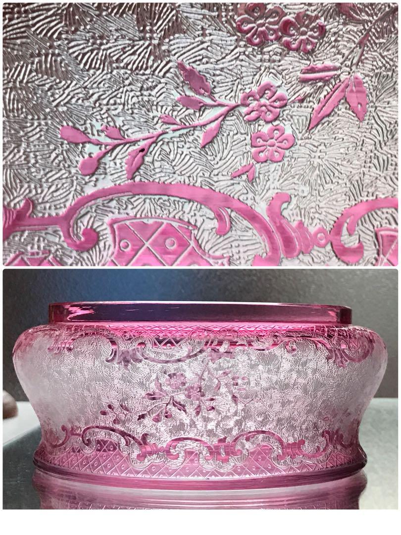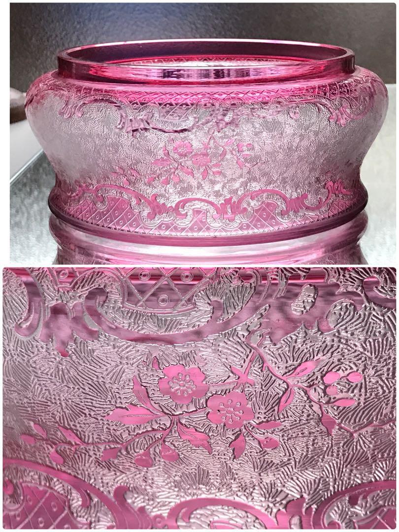 色被せクリスタルにエッチングでピンクの野ばらの模様を浮き彫りにし、残りの透明のクリスタルの部分に