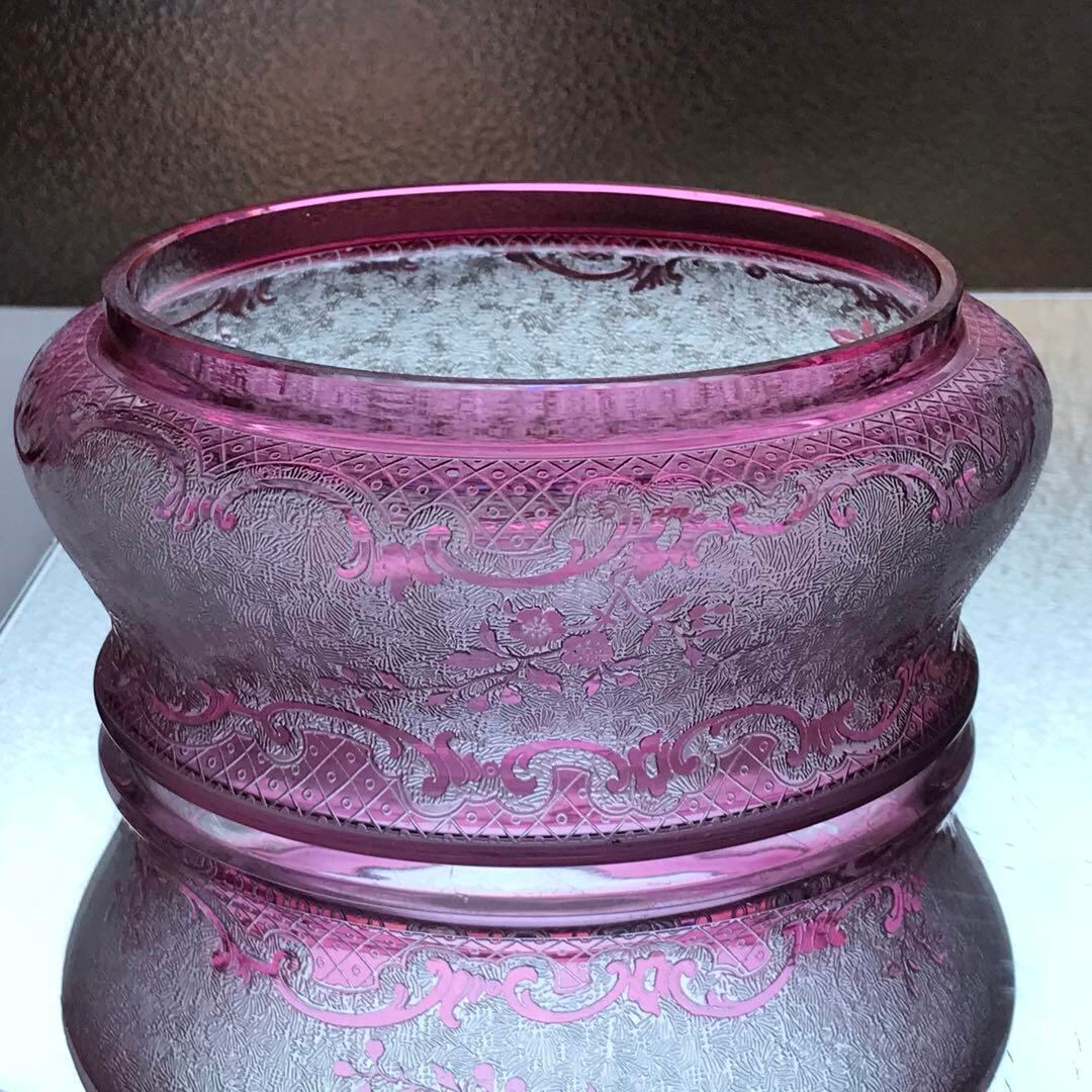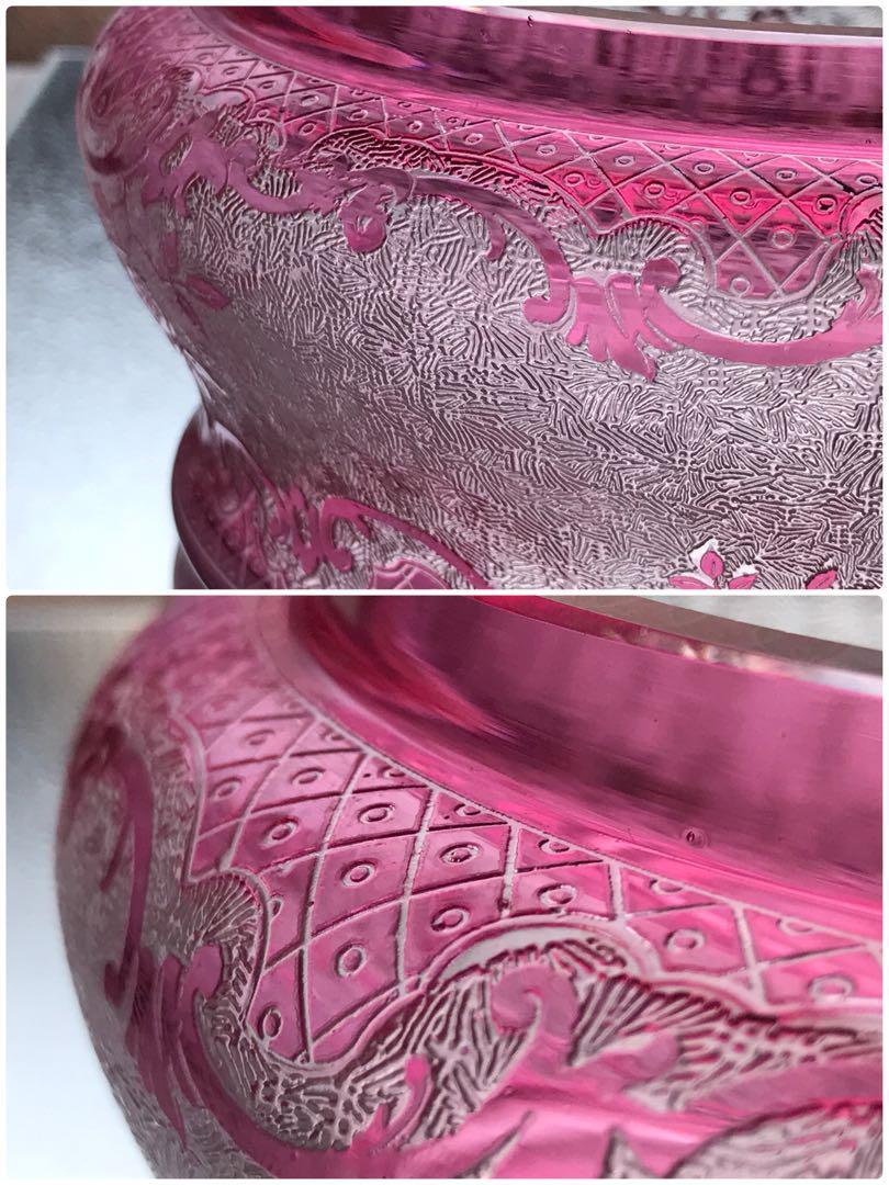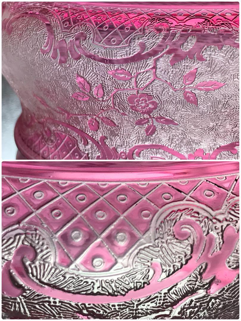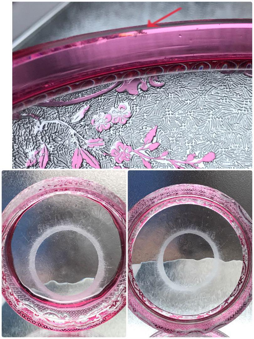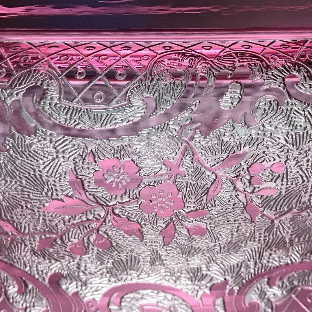 色被せクリスタルにエッチングでピンクの野ばらの模様を浮き彫りにし、残りの透明のクリスタルの部分に