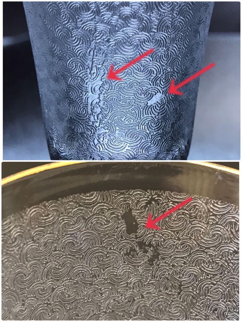 製造時についた細かい気泡(P.8)、あまり目立ちませんが模様の乱れ(P.10)がございます。