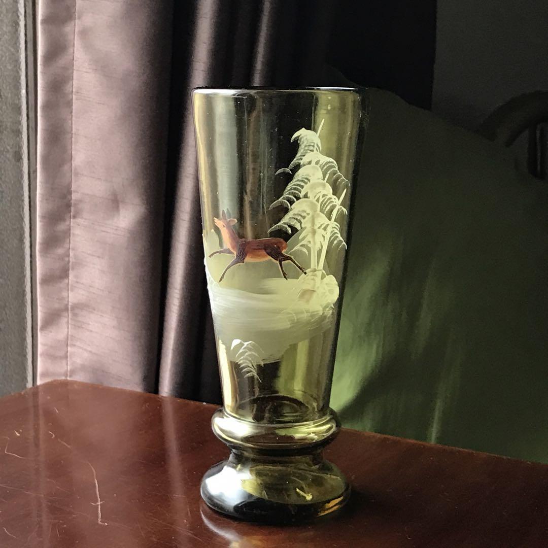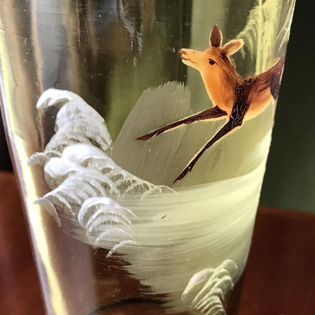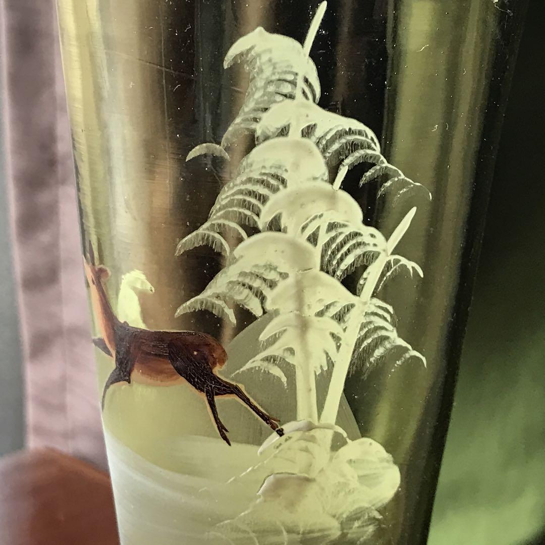 美しいフランスアンティーク クリスタル★元気な鹿と雪山の花瓶★淡いモスグリーン色