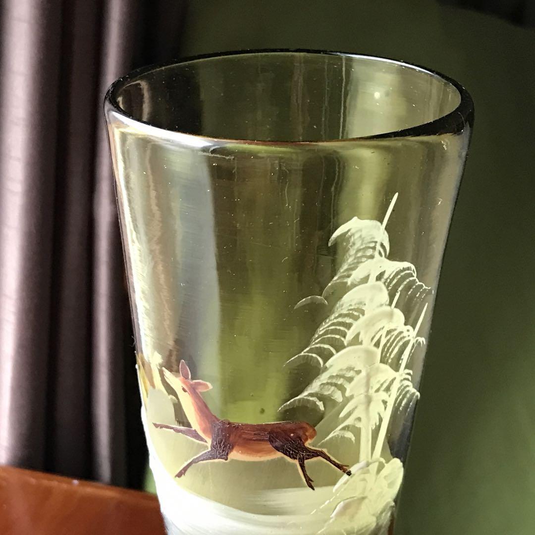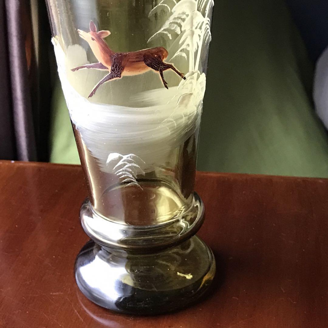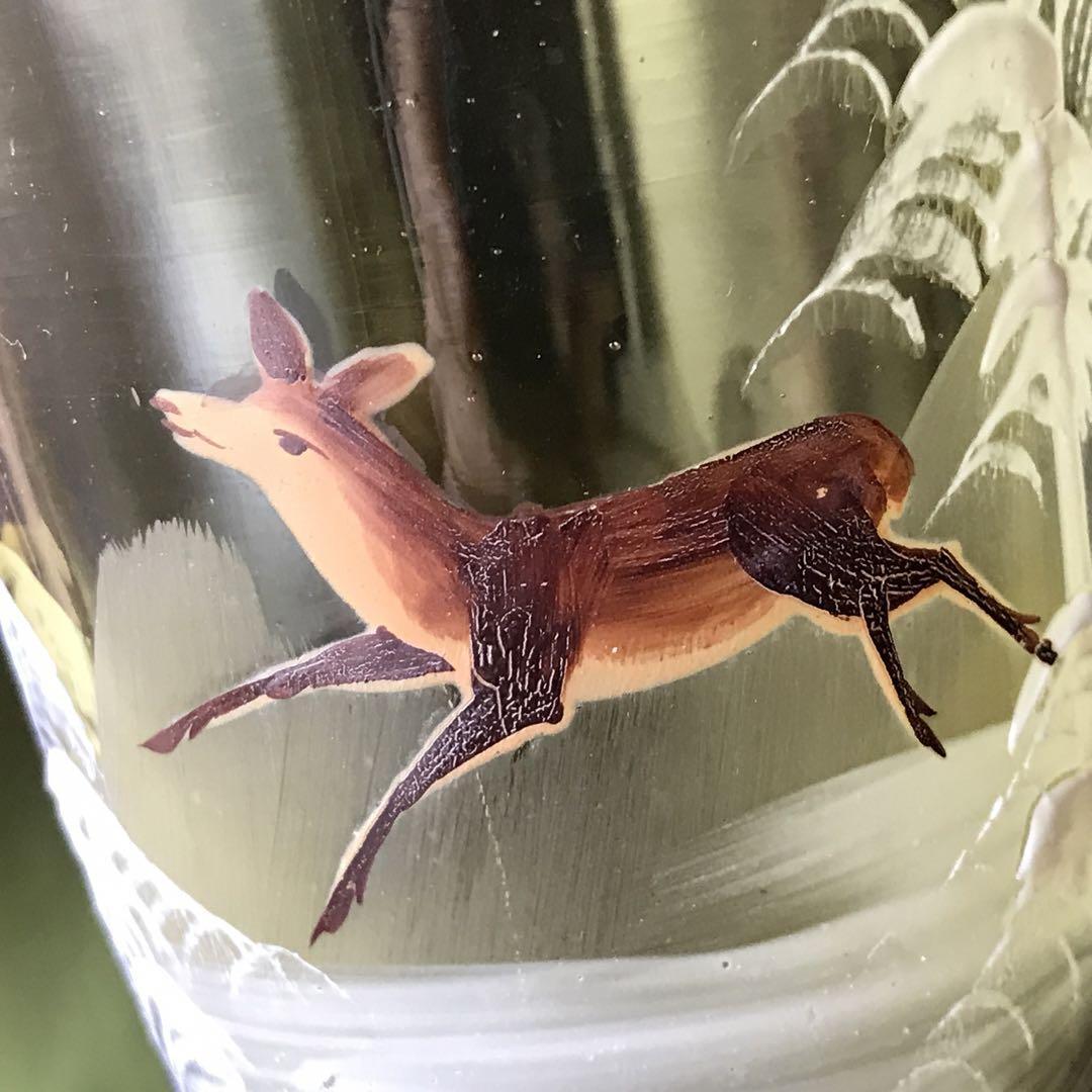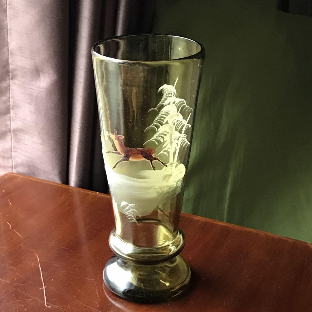 美しいフランスアンティーク クリスタル★元気な鹿と雪山の花瓶★淡いモスグリーン色