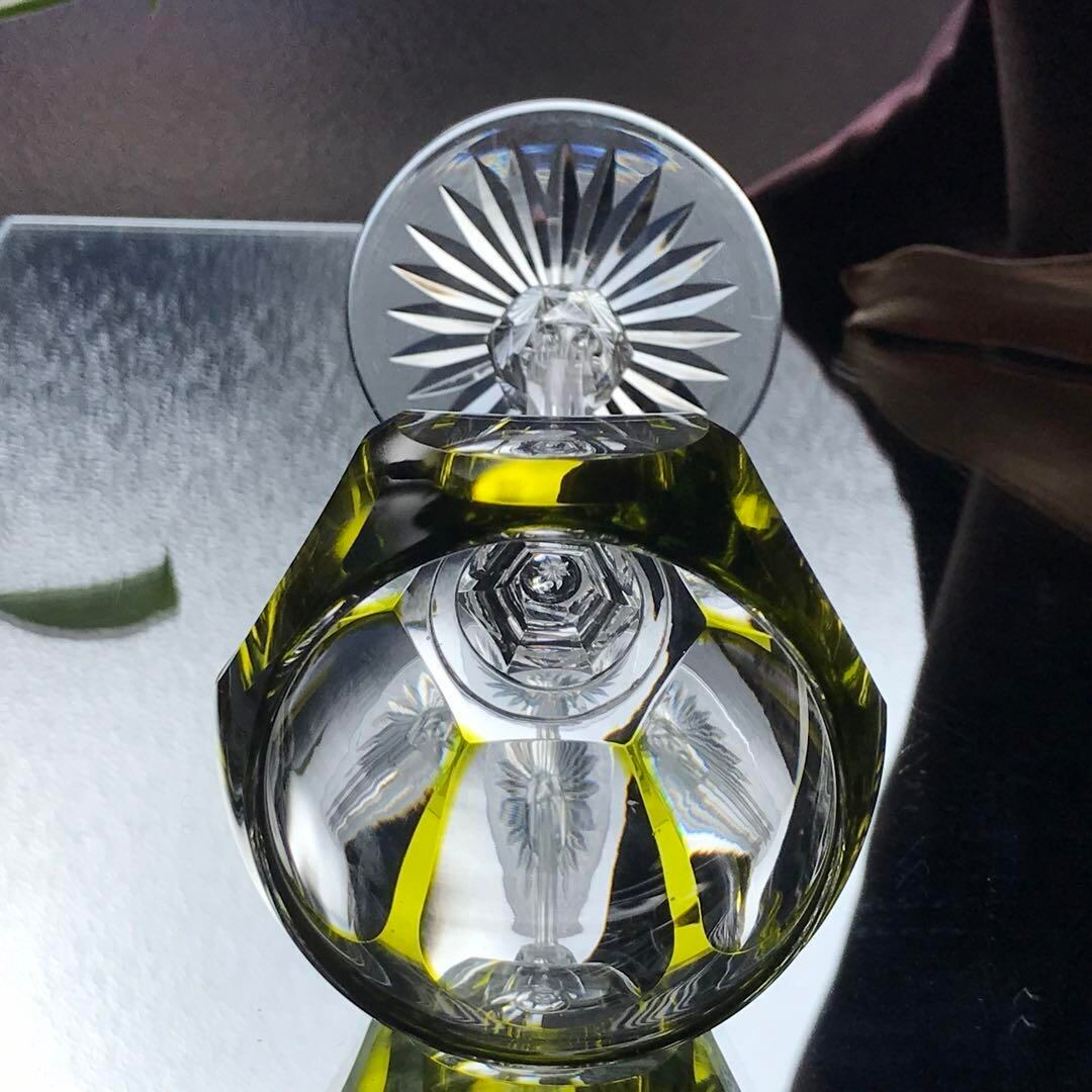 透明なクリスタルガラスの上に綺麗なモスグリーン色の