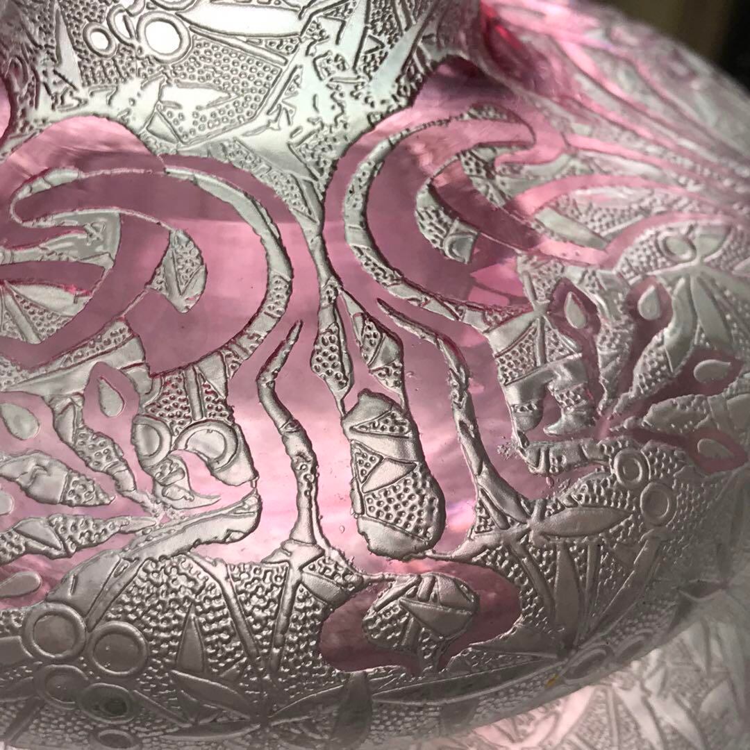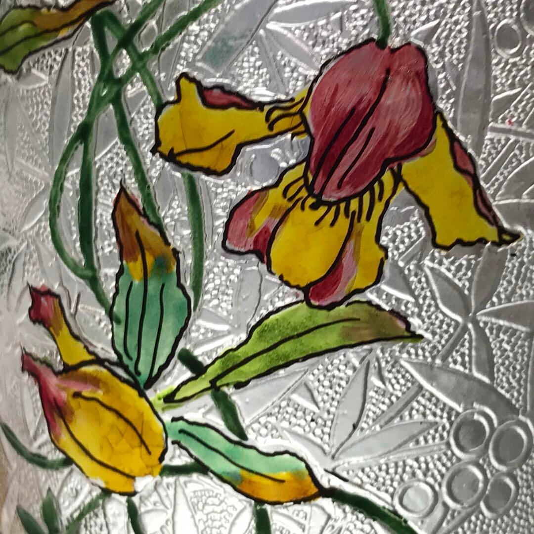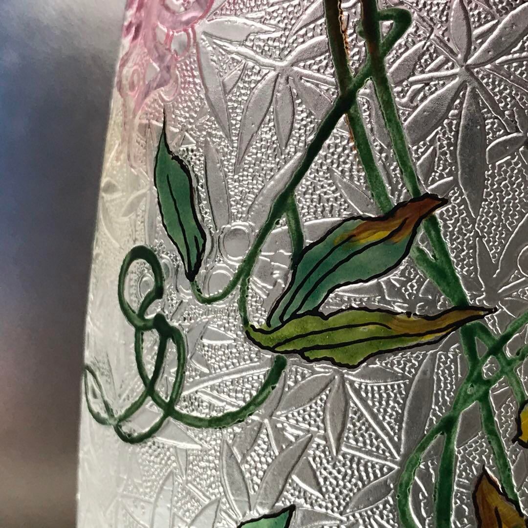 素地に半透明のフロスト加工の上から細かく植物がえがかれています。