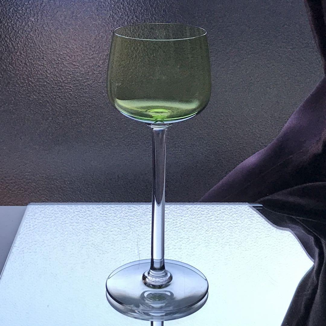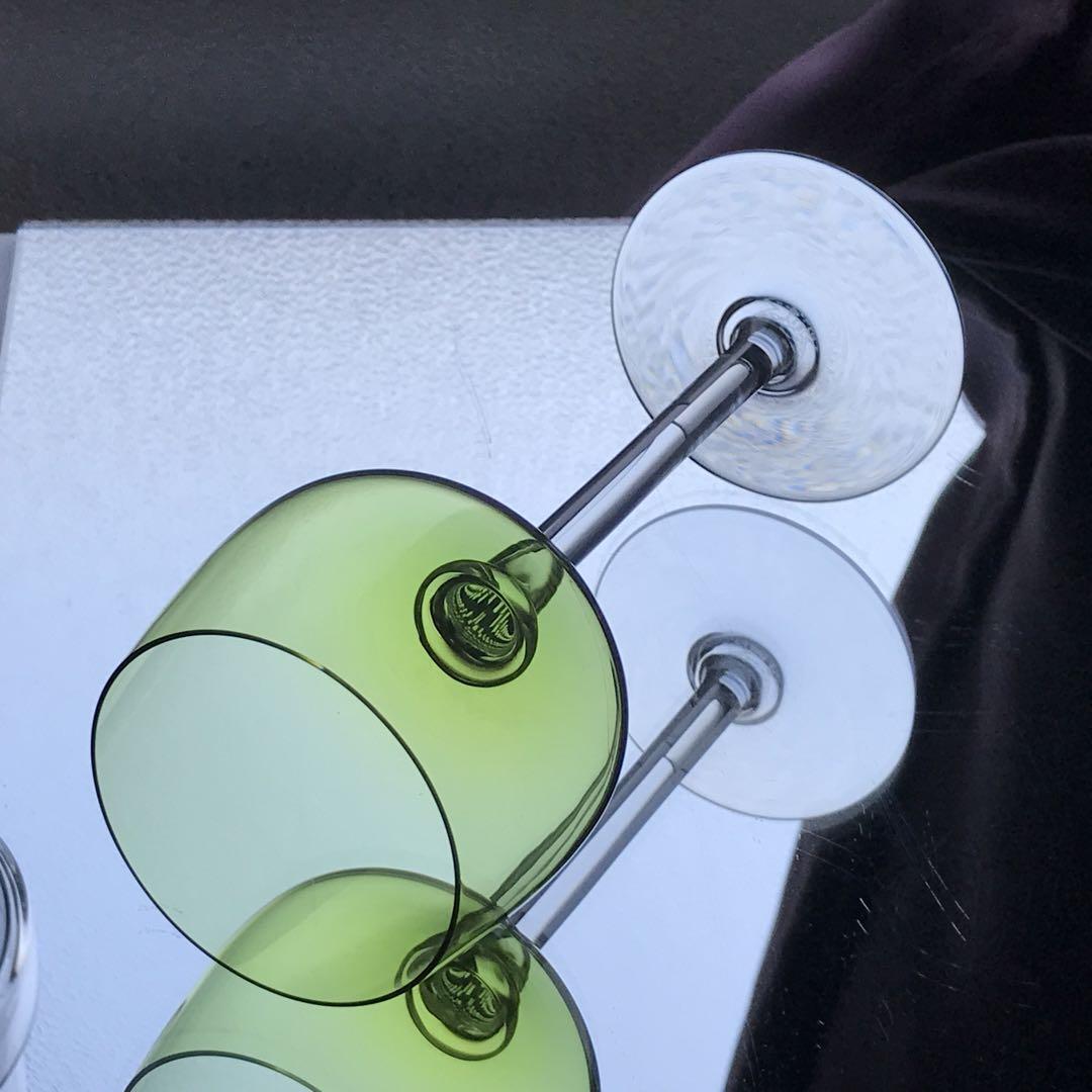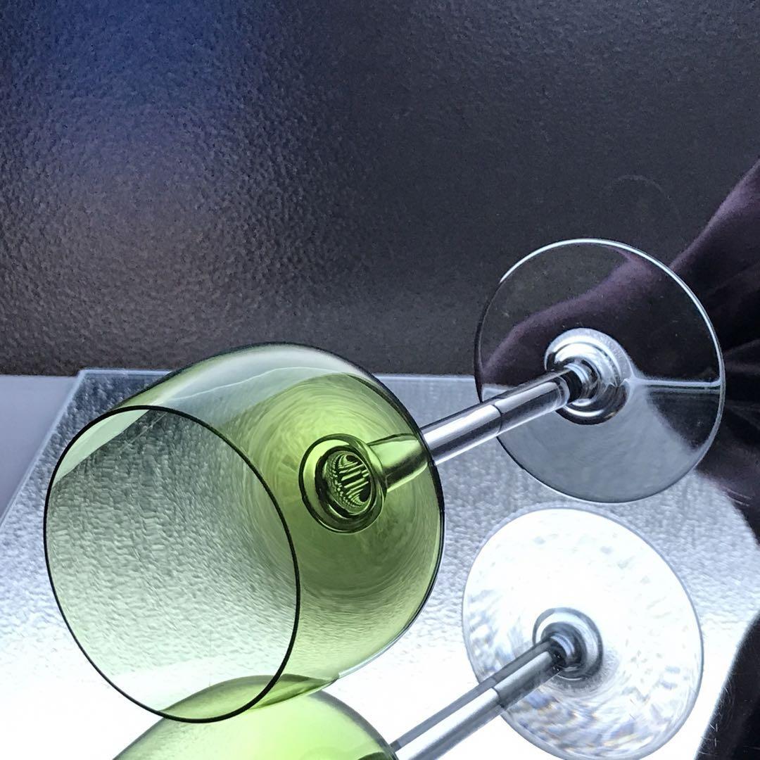 綺麗に透き通った淡緑色のエレガントなワイングラスです。