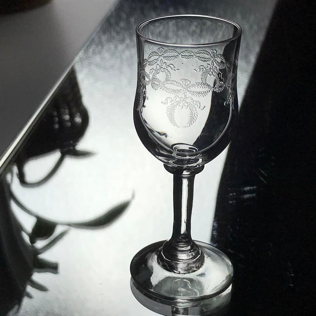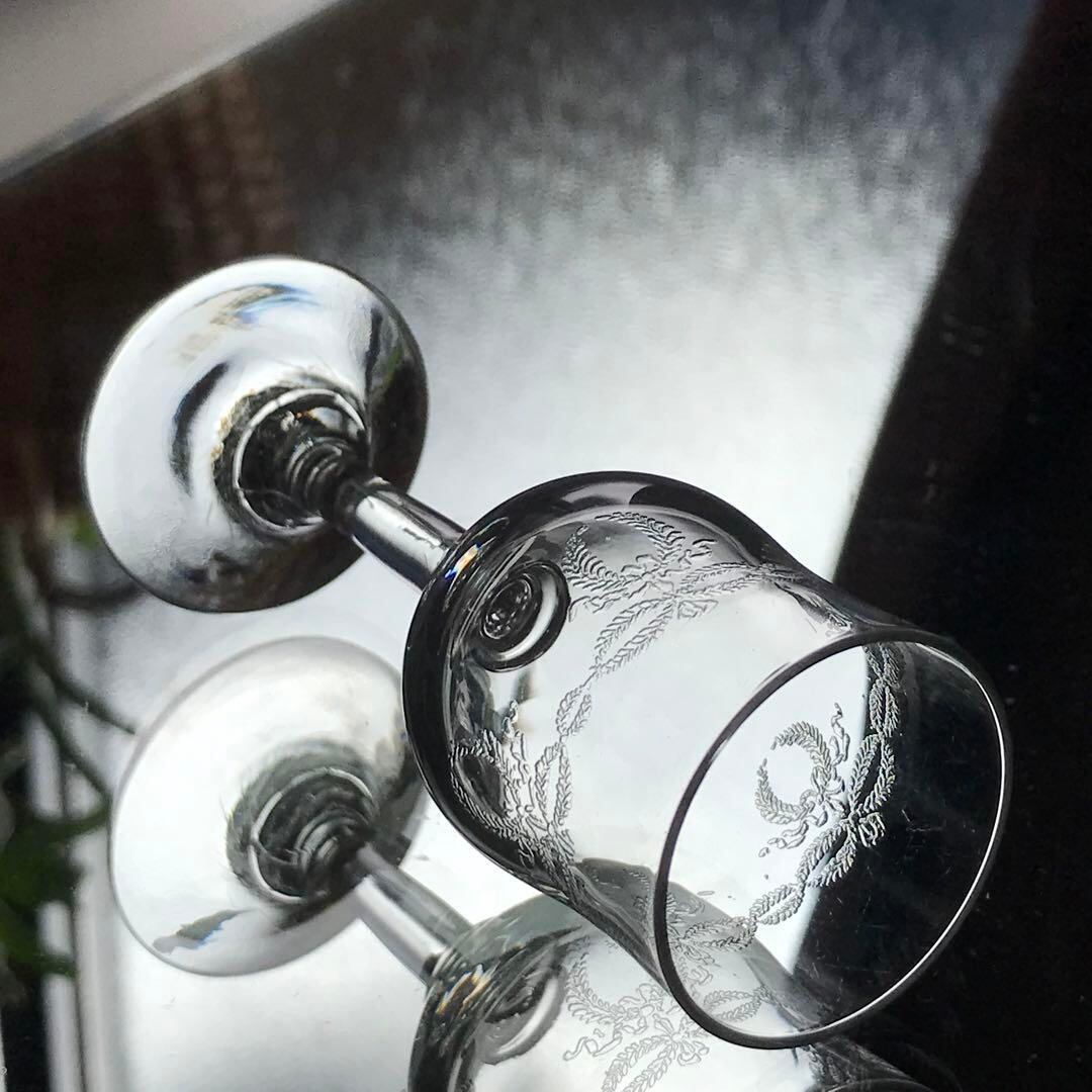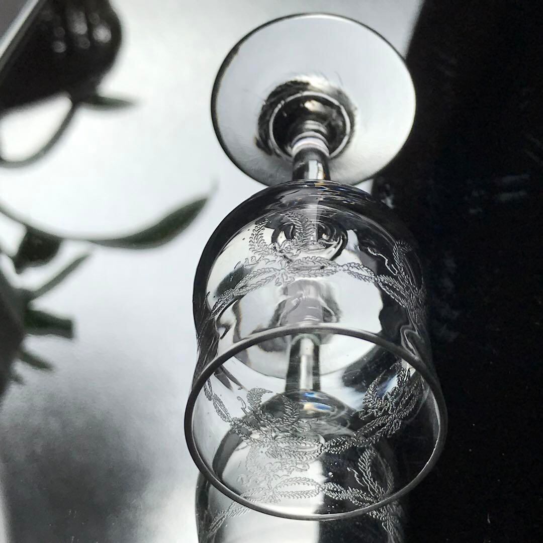 勝利、繁栄、栄光を讃える月桂樹の葉がグラスの周りに細かく丁寧に描かれ
