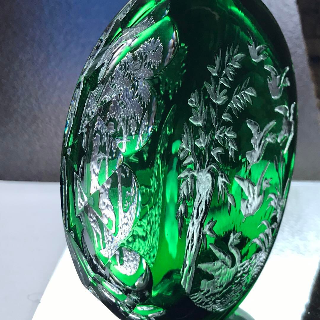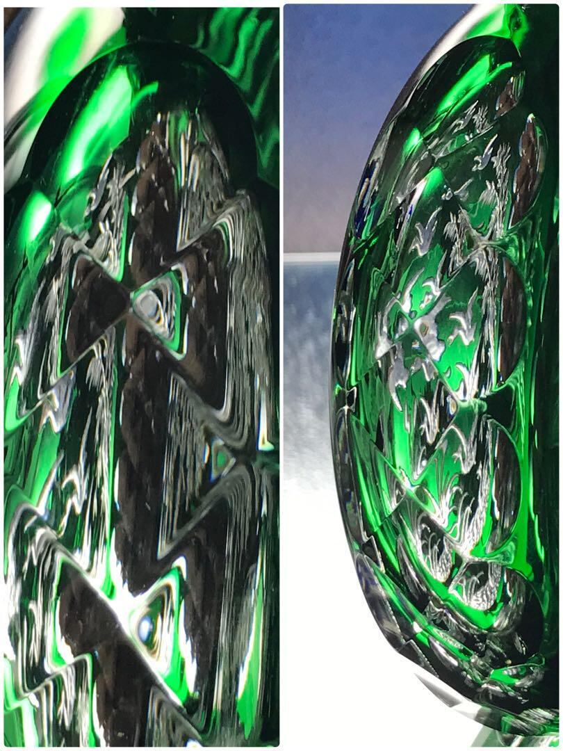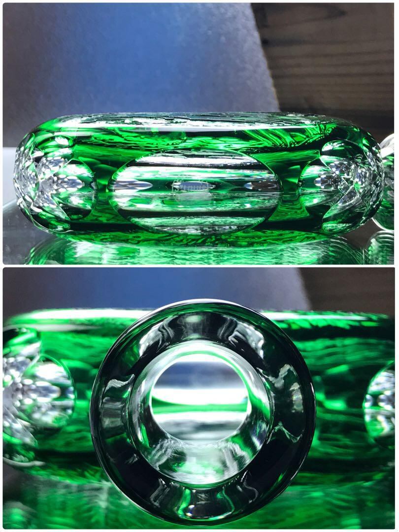 透明のクリスタルガラスのうえに美しい緑色のクリスタルガラスを被せ