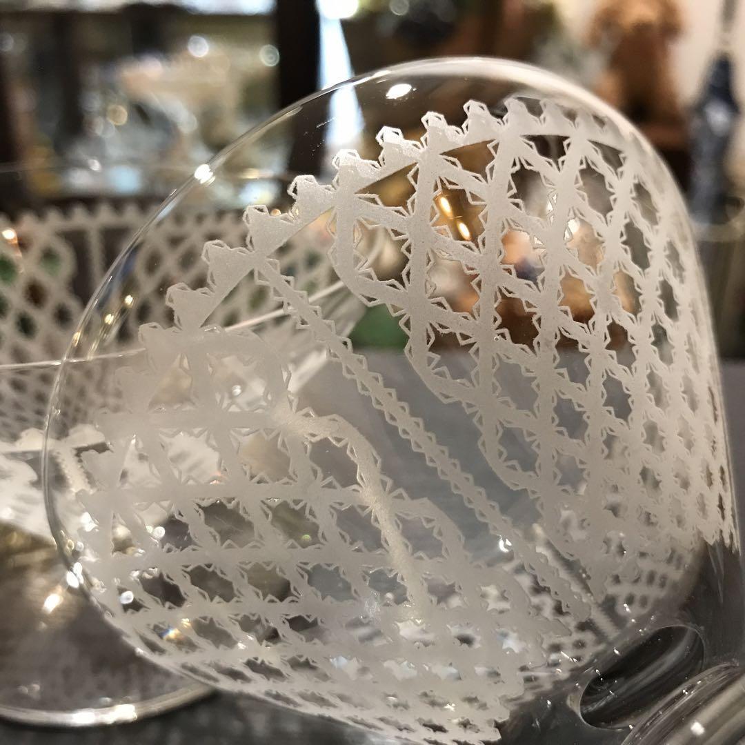 美しいレースで縁取りされたリボンが格子状に丁寧にグラス全体に施されています。